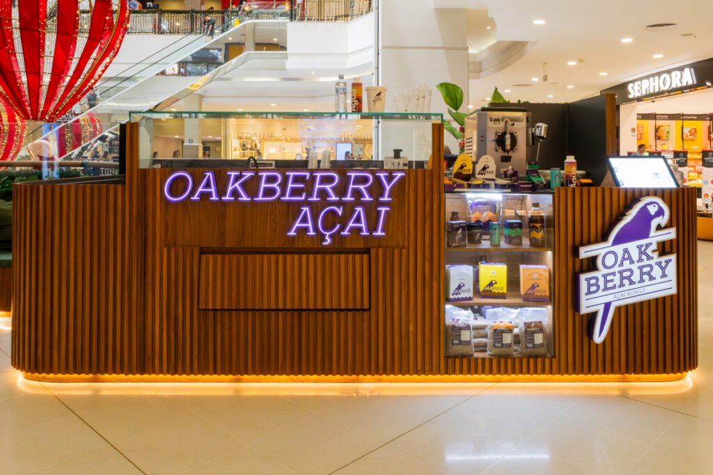 O quiosque Oakberry é especializado em açaí, oferecendo uma experiência saudável e saborosa. Os clientes podem personalizar suas opções com uma variedade de frutas, granola e outras coberturas.